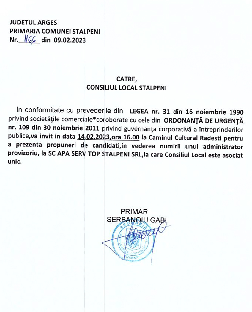 Astăzi, 14 februarie 2023, de la ora 16.00, este convocat „în numele legii” Consiliul local Stâlpeni, de către primarul Gabi Șerbănoiu, pentru a se găsi și numi un administrator interimar la SC APA TOP SERV STÂLPENI SRL.