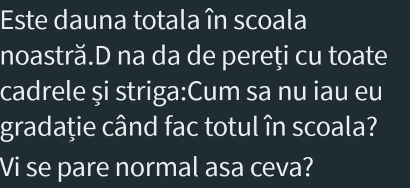 Nu, nimic din toate acestea. Doamna este supărată că nu a primit gradație de merit. „Este daună totală”, ne-a transmis o sursă din școlile din comună. ”Doamna dă de pereți cu toate cadrele didactice și strigă <<Cum să nu iau eu gradație, când fac totul în școală? Vi se pare normal așa ceva?>>”
