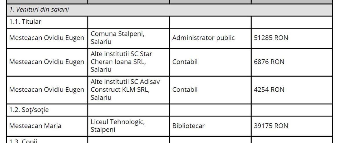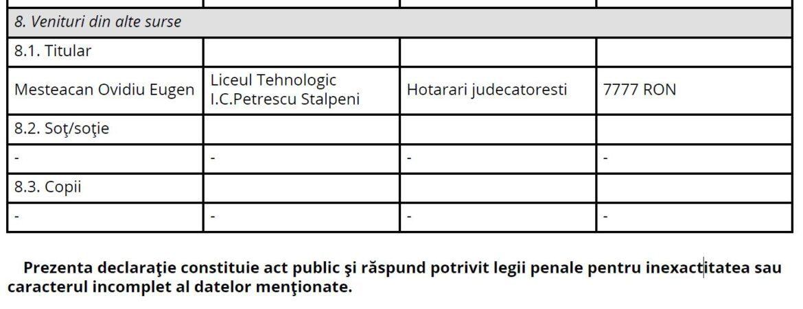 Printre cele 14 declarații am găsit și declarația de avere a administratorului public al comunei Stâlpeni, domnul Mesteacăn Eugen. Aceasta conține la capitolul „venituri din alte resurse”, suma de 7.777 lei, sursa banilor fiind hotărârile judecătorești obținute în detrimentul liceului Stâlpeni, acolo unde a fost angajat până la finalul anului 2020 pe funcția de contabil-șef.
