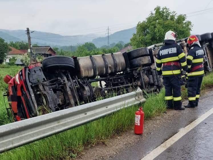 Tot în localitatea Stâlpeni, s-a produs tot astăzi un alt eveniment rutier în care un autotren cu remorcă s-a răsturnat.